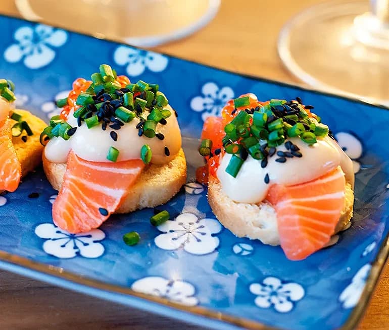 Laxcrostini med wasabi- och sojamajonnäs och forellrom