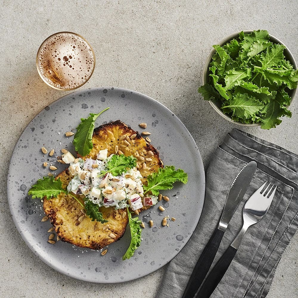 Sellerischnitzel med äppelsallad och solrosfrön