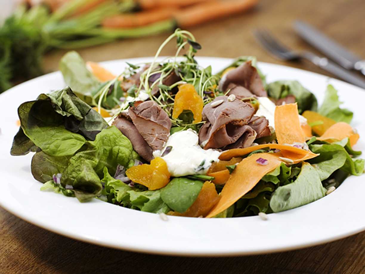 Rostbiffssallad med aprikos och solrosfrö