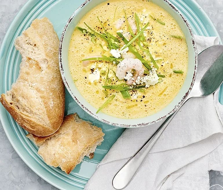 Morotssoppa med fetaost och räkor