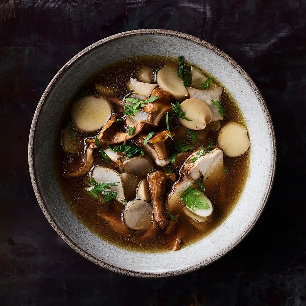 Svampbuljong med kyckling och jordärtskocka