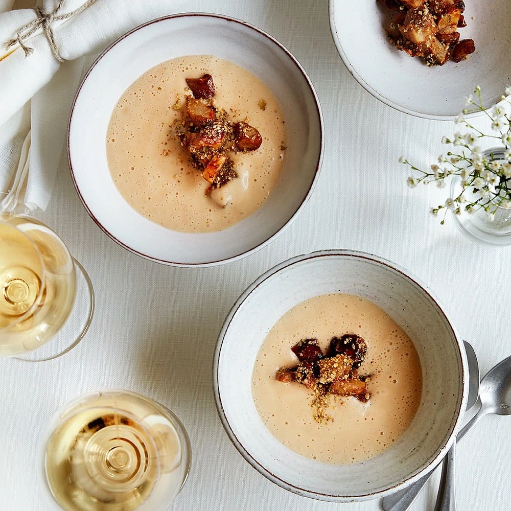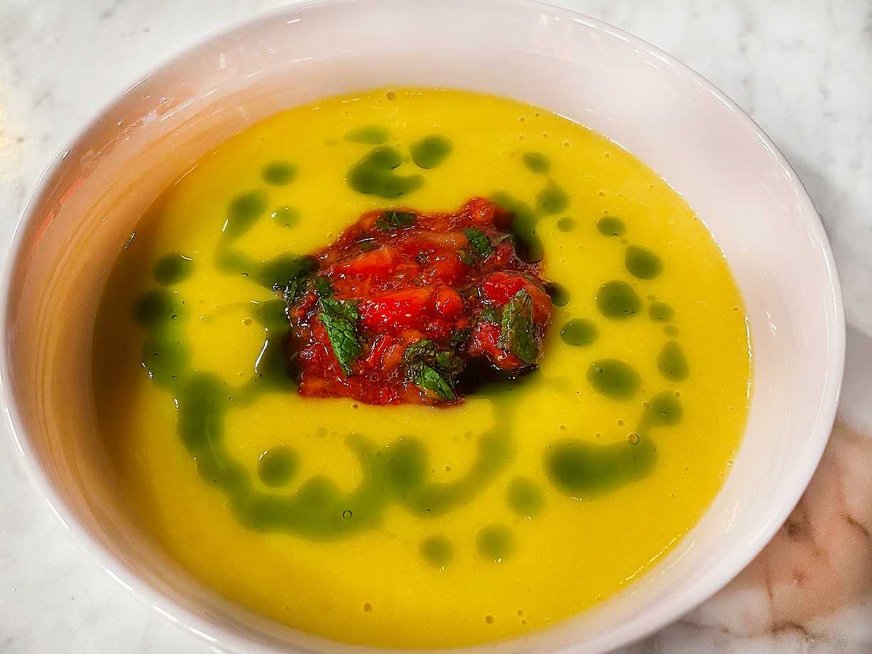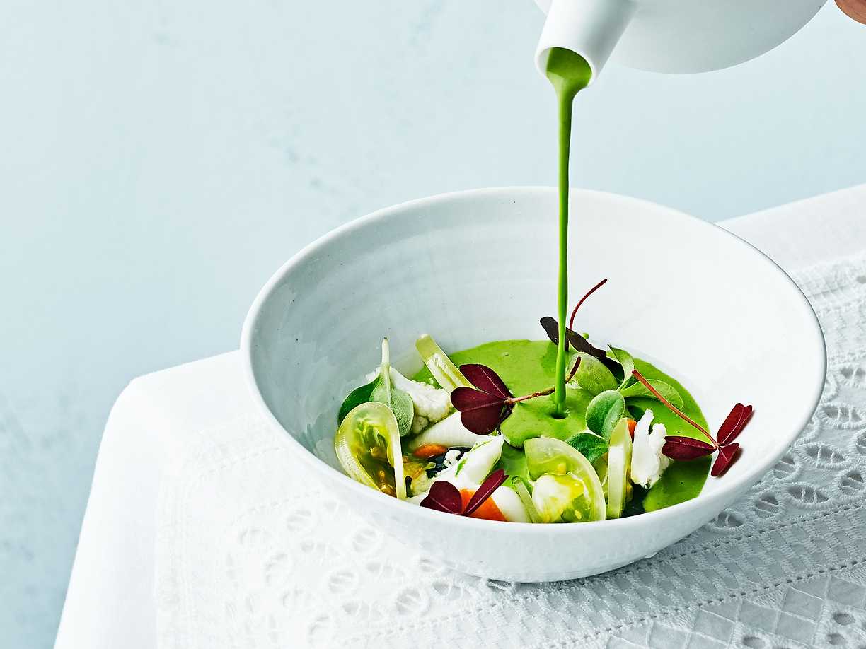 Gazpacho på äpple och mynta med pestopizza