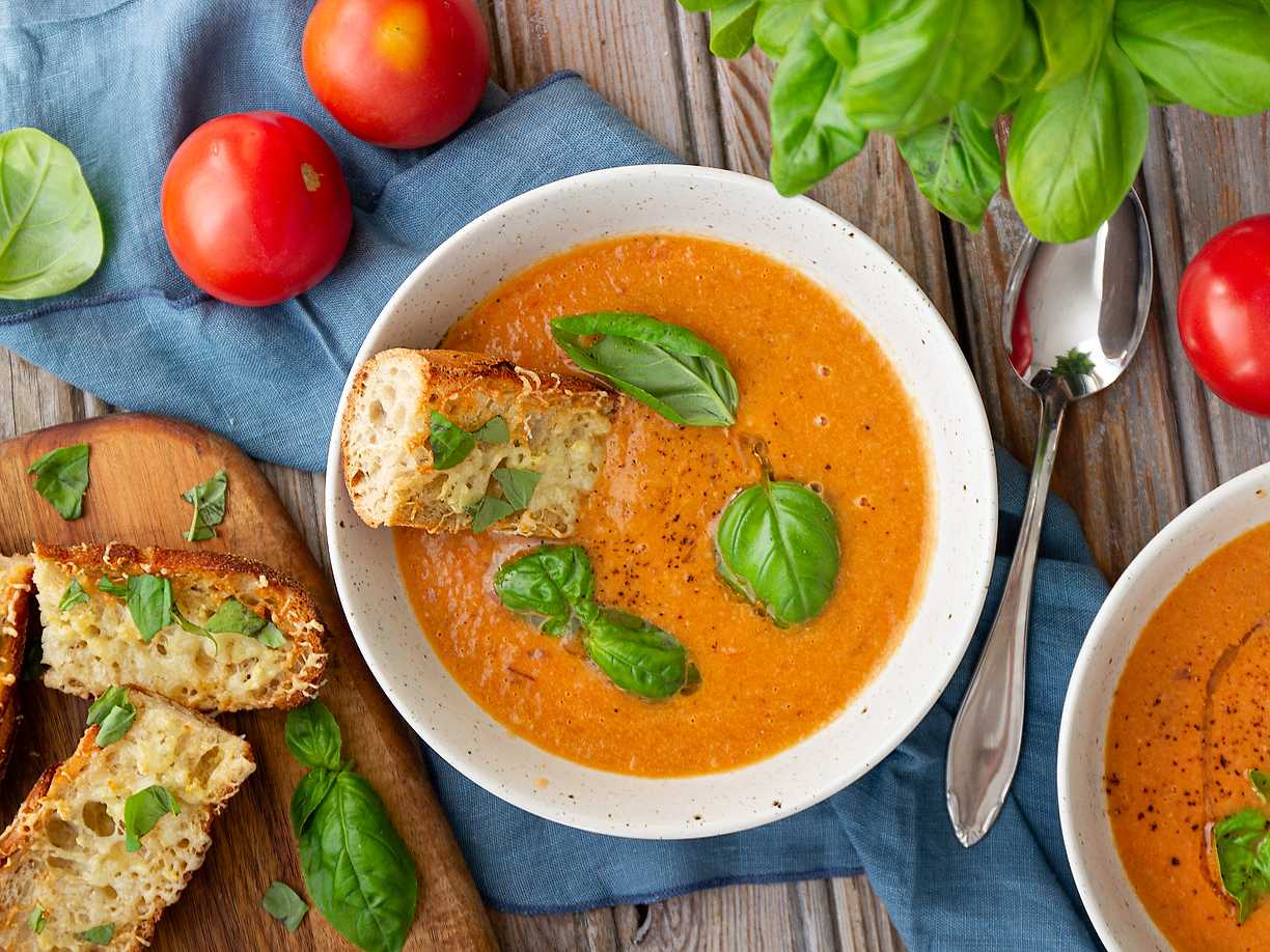 Tomatsoppa med ostgratinerat vitlöksbröd