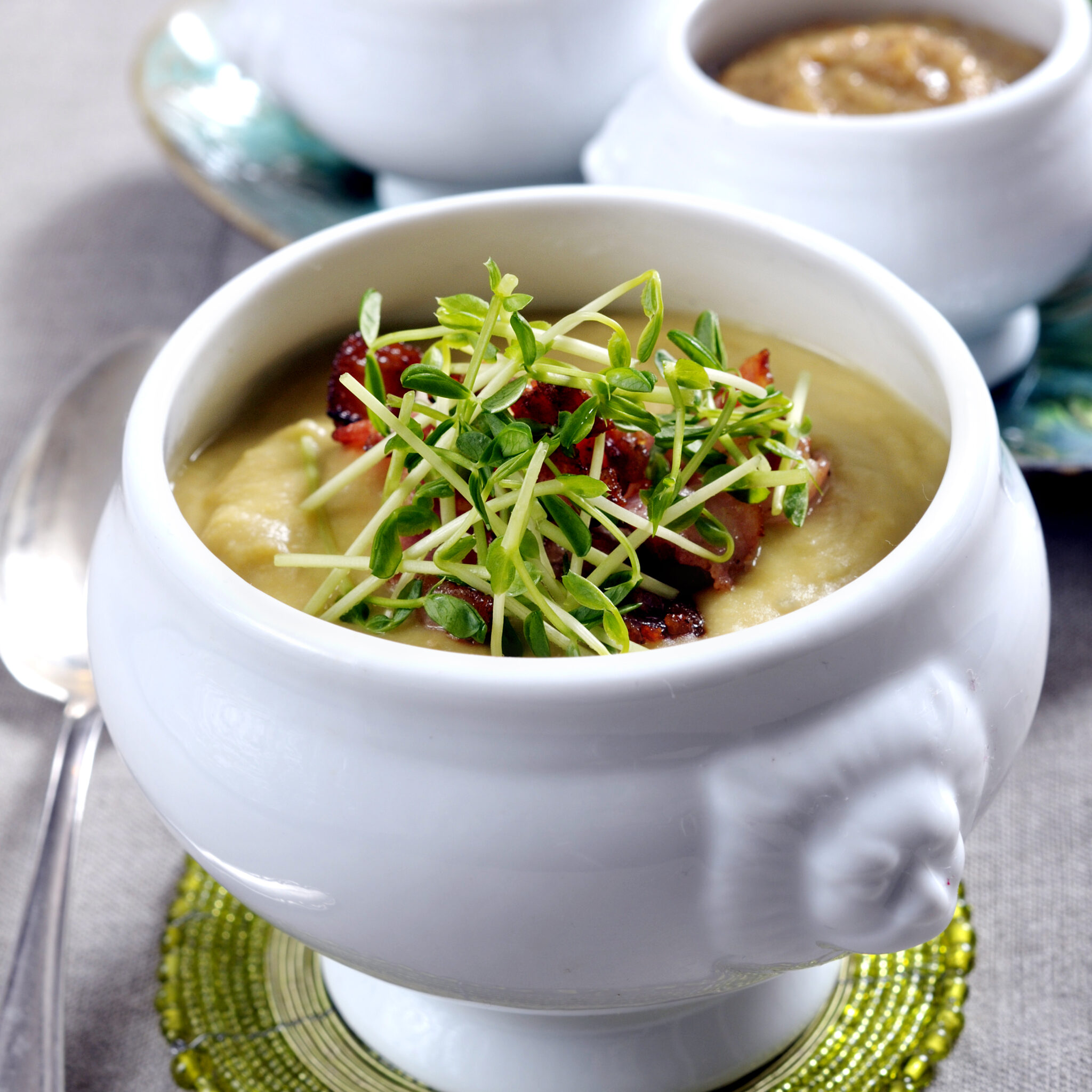 Laktosfri grönärtssoppa med yoghurt och grissini