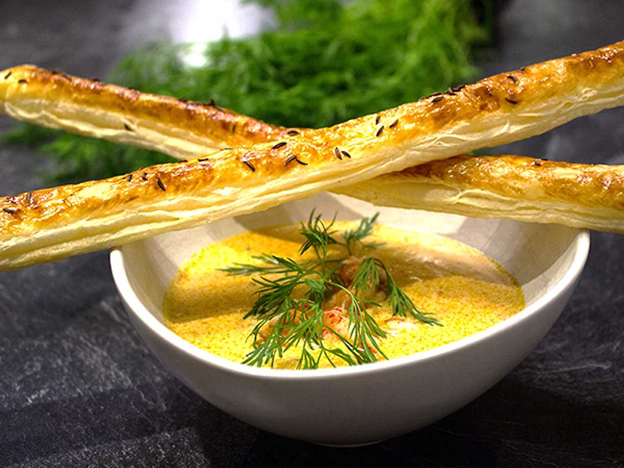 Krämig kräftsoppa med kumminpinnar