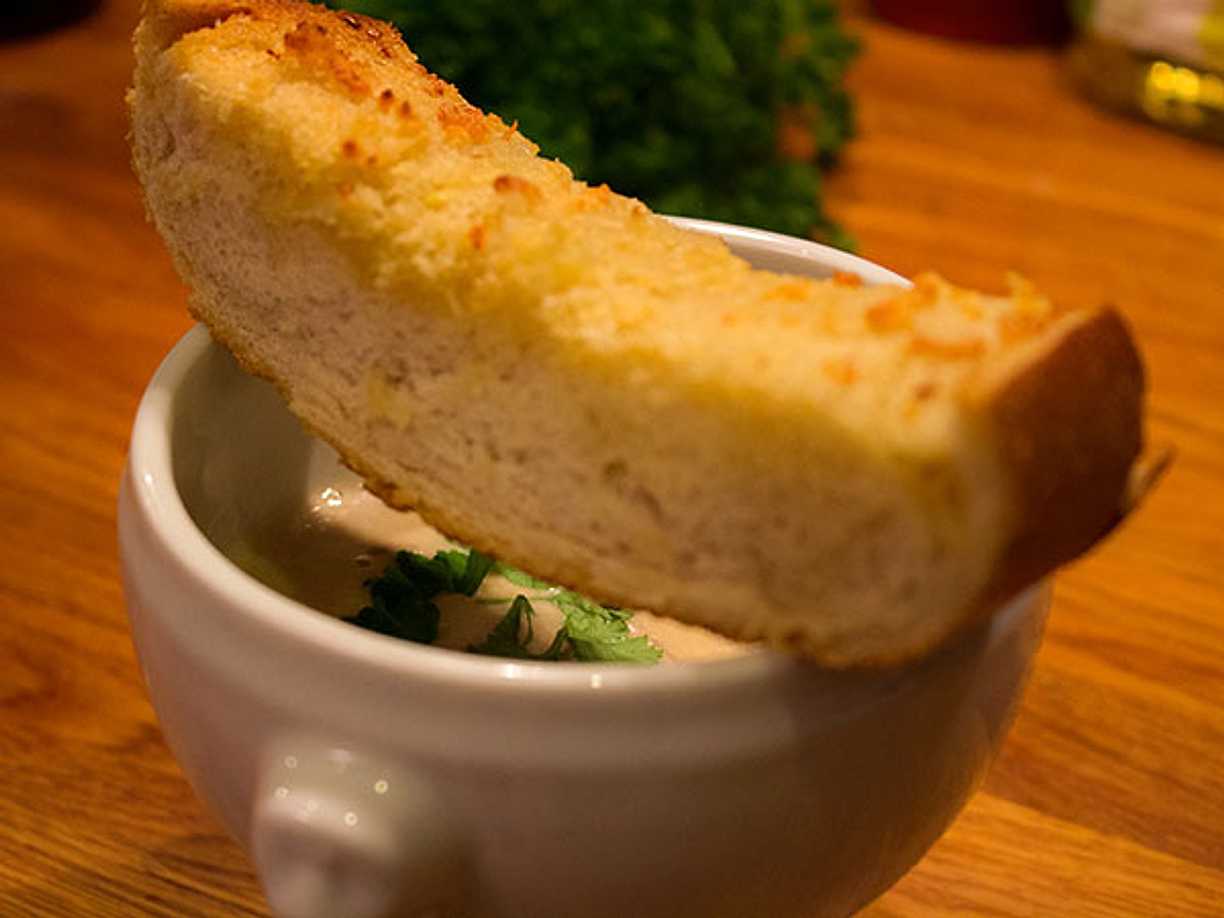 Krämig svampsoppa med sting och vitlöksbröd