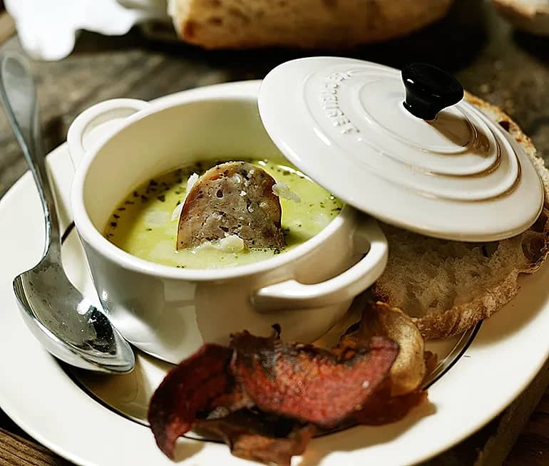 Isad sparris- och potatissoppa med västerbottenschips