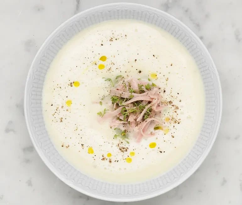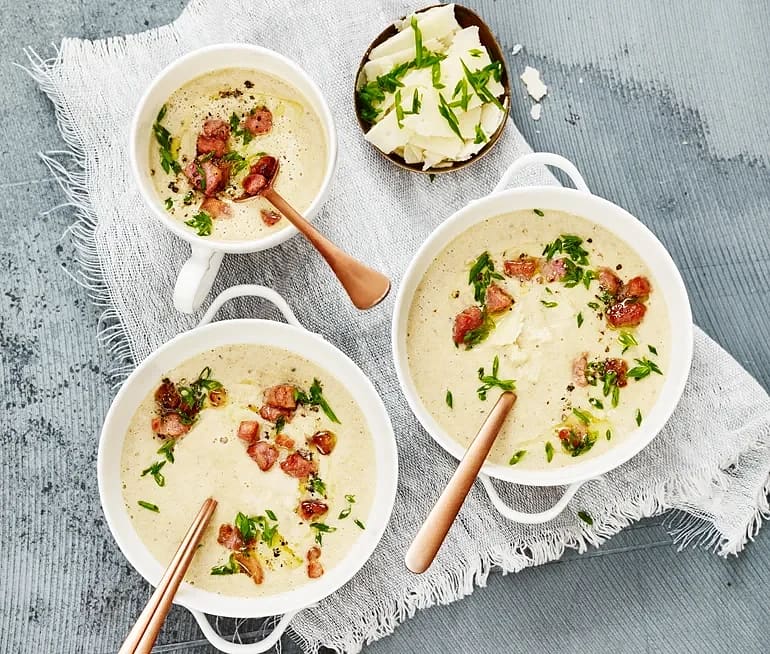 Blomkål- och ostsoppa med krasse och rökt skinka