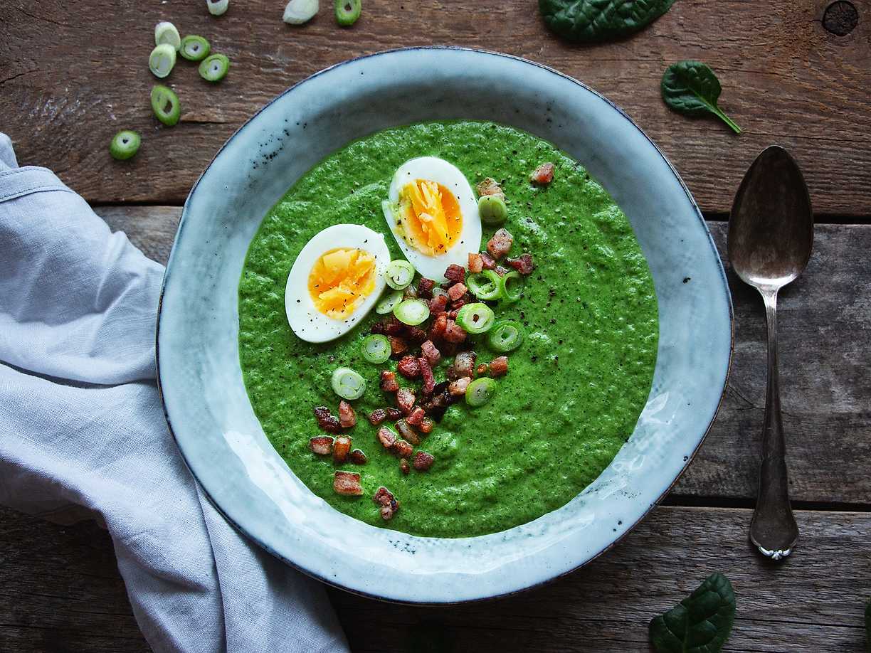 Krämig spenat- och broccolisoppa med ägg och bacon