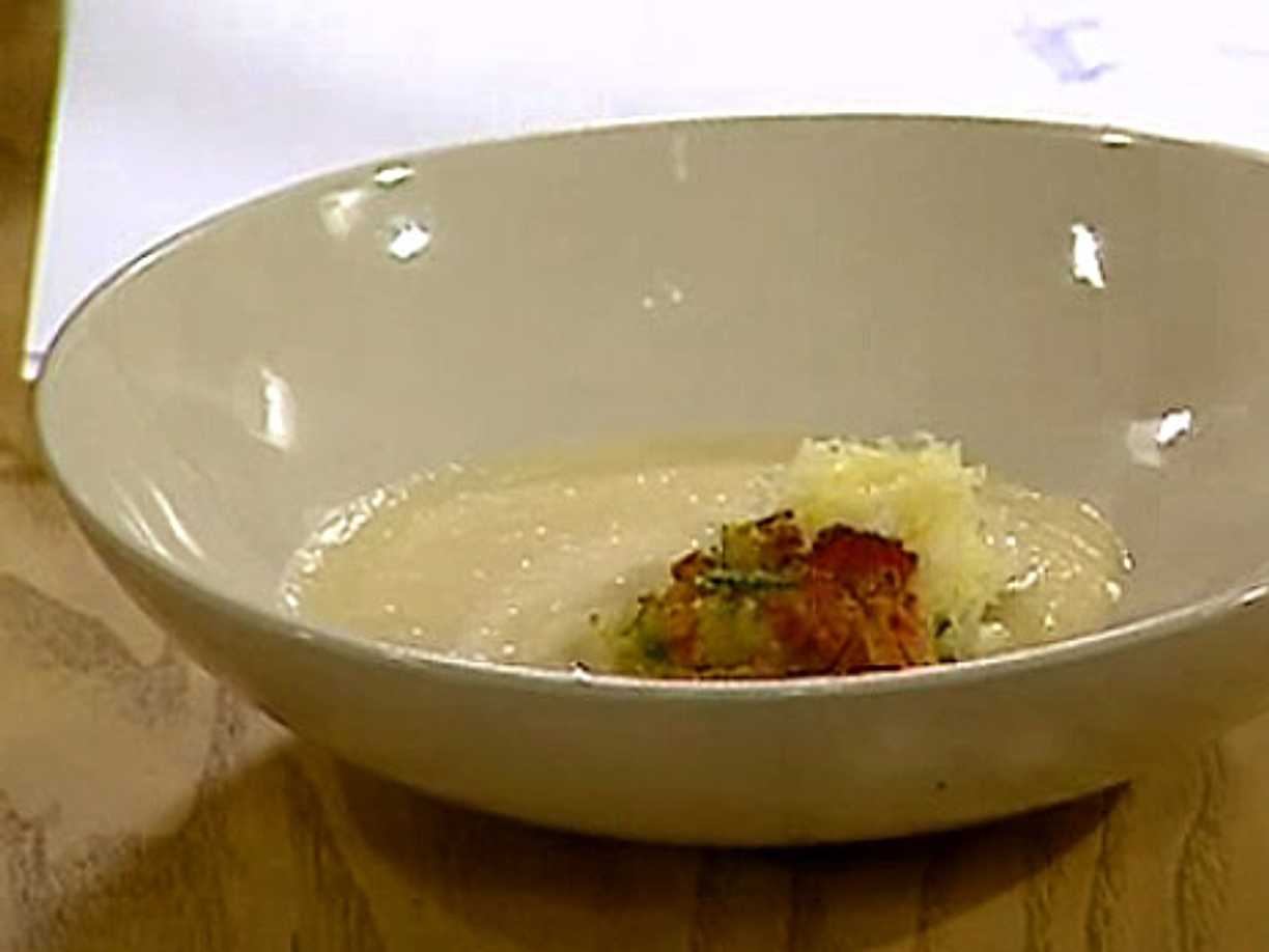 Skummig soppa på dill med kolja, pilgrimsmousseline och citronglaserade rotisar