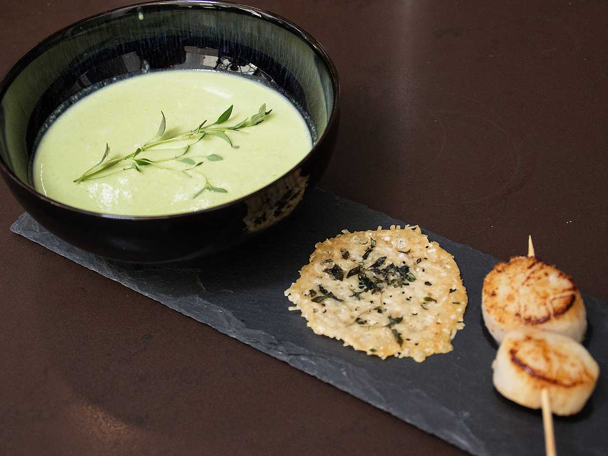 Skön, grön ärtsoppa med parmesanchips och pilgrimsmussla