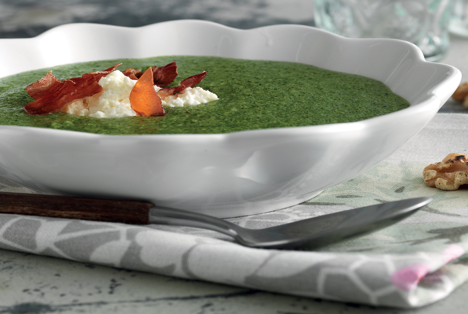 Ärtig soppa med skink- och paprikatortilla