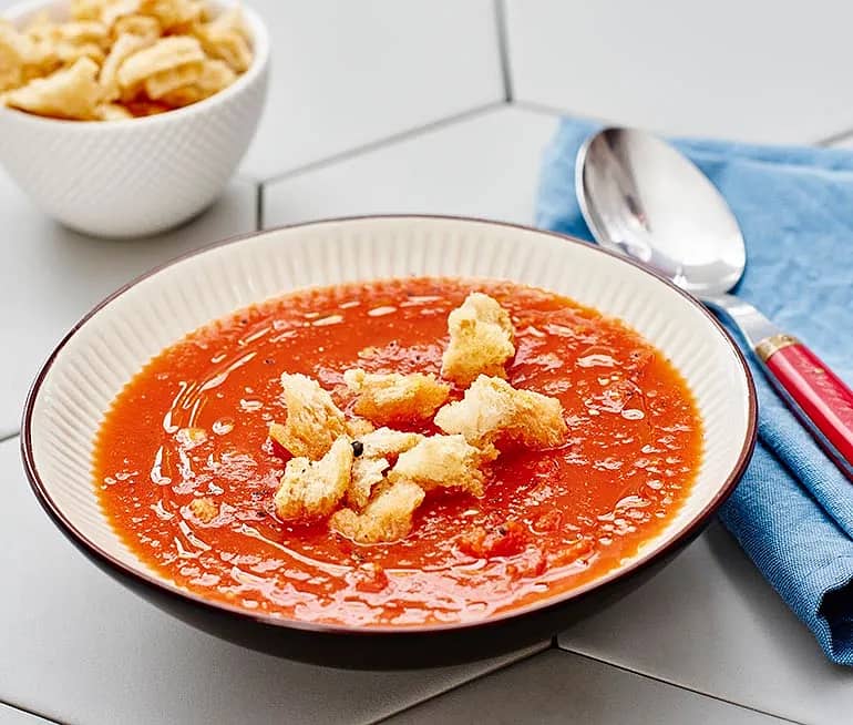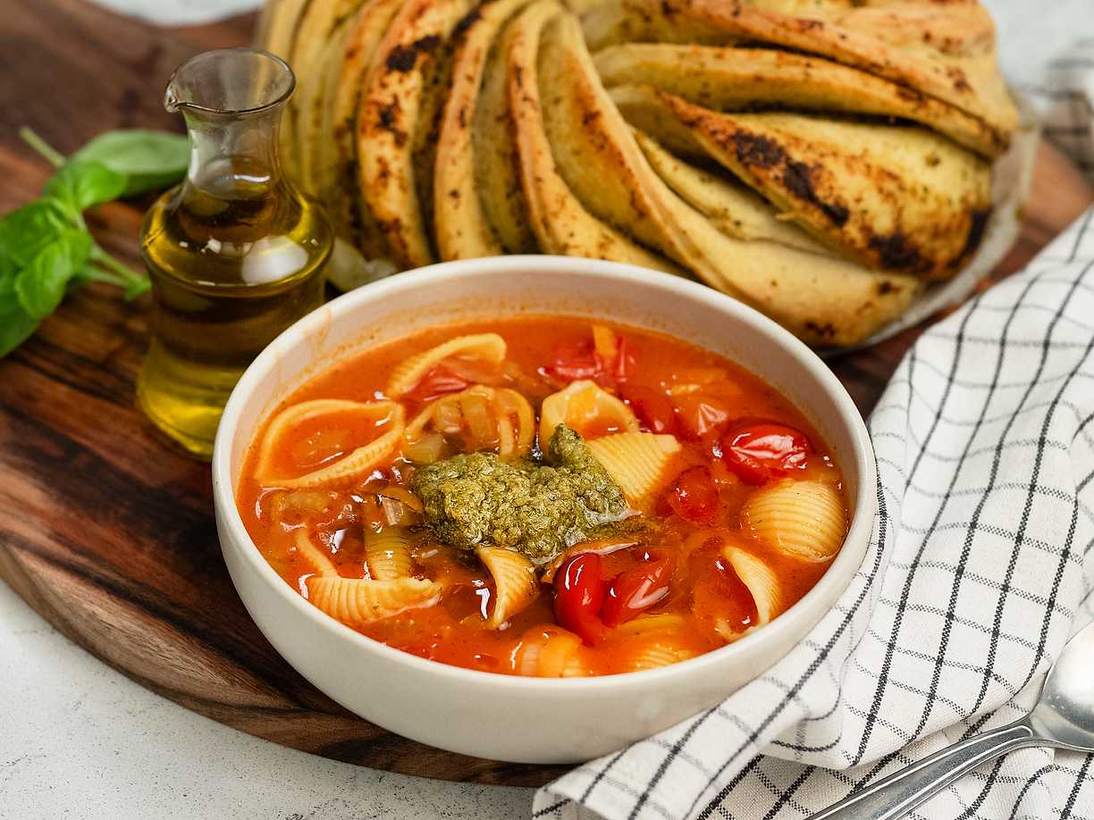 Tomatsoppa med pasta och vitlöksbröd