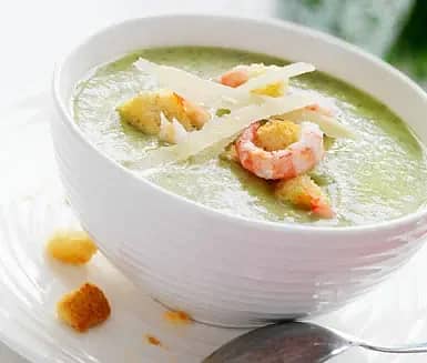 Broccolisoppa med parmesan, krutonger och räkor