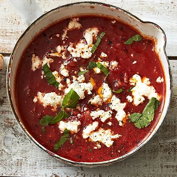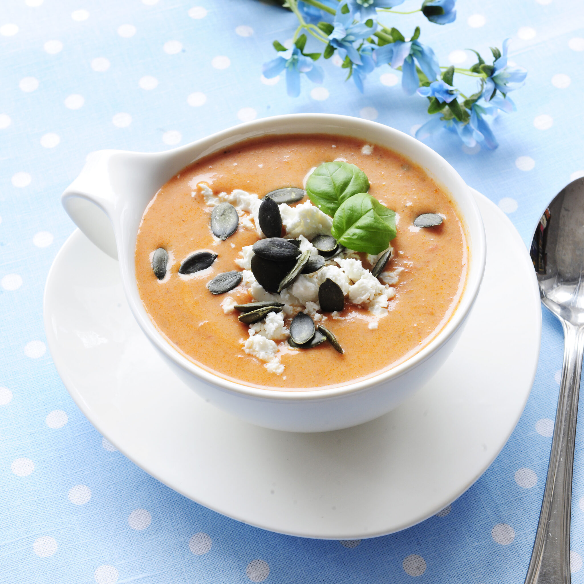 Tomatsoppa med chèvre och basilika