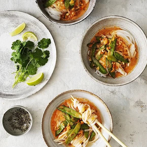 Nudelsoppa med färdiggrillad kyckling och sockerärtor