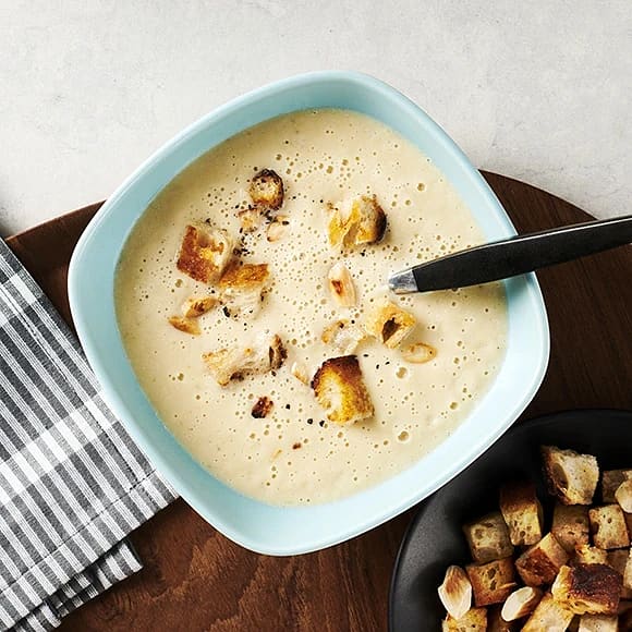 Jordärtskocksoppa med bacon, äpple och rågbrödskrutonger