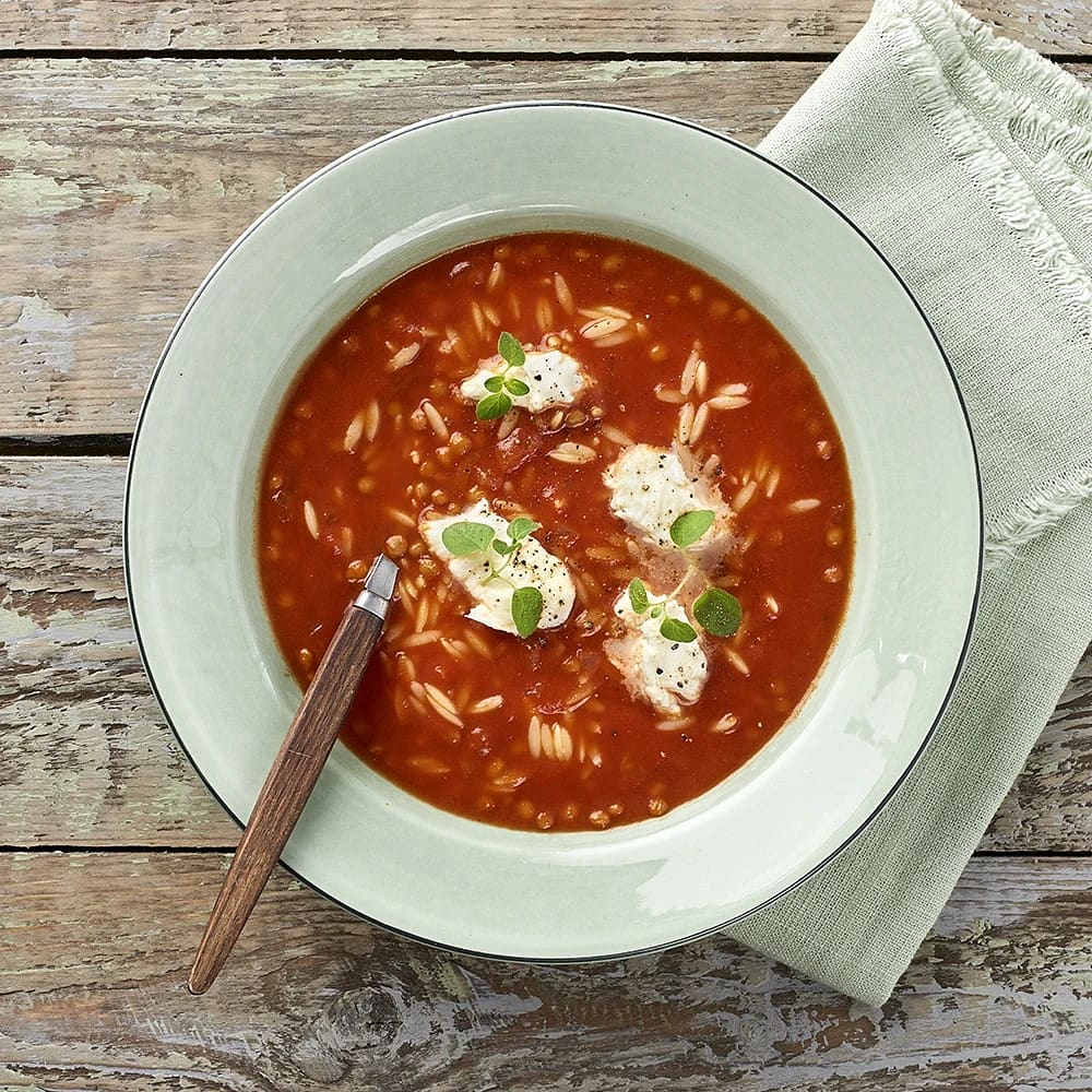 Tomatsoppa med risoni och feta