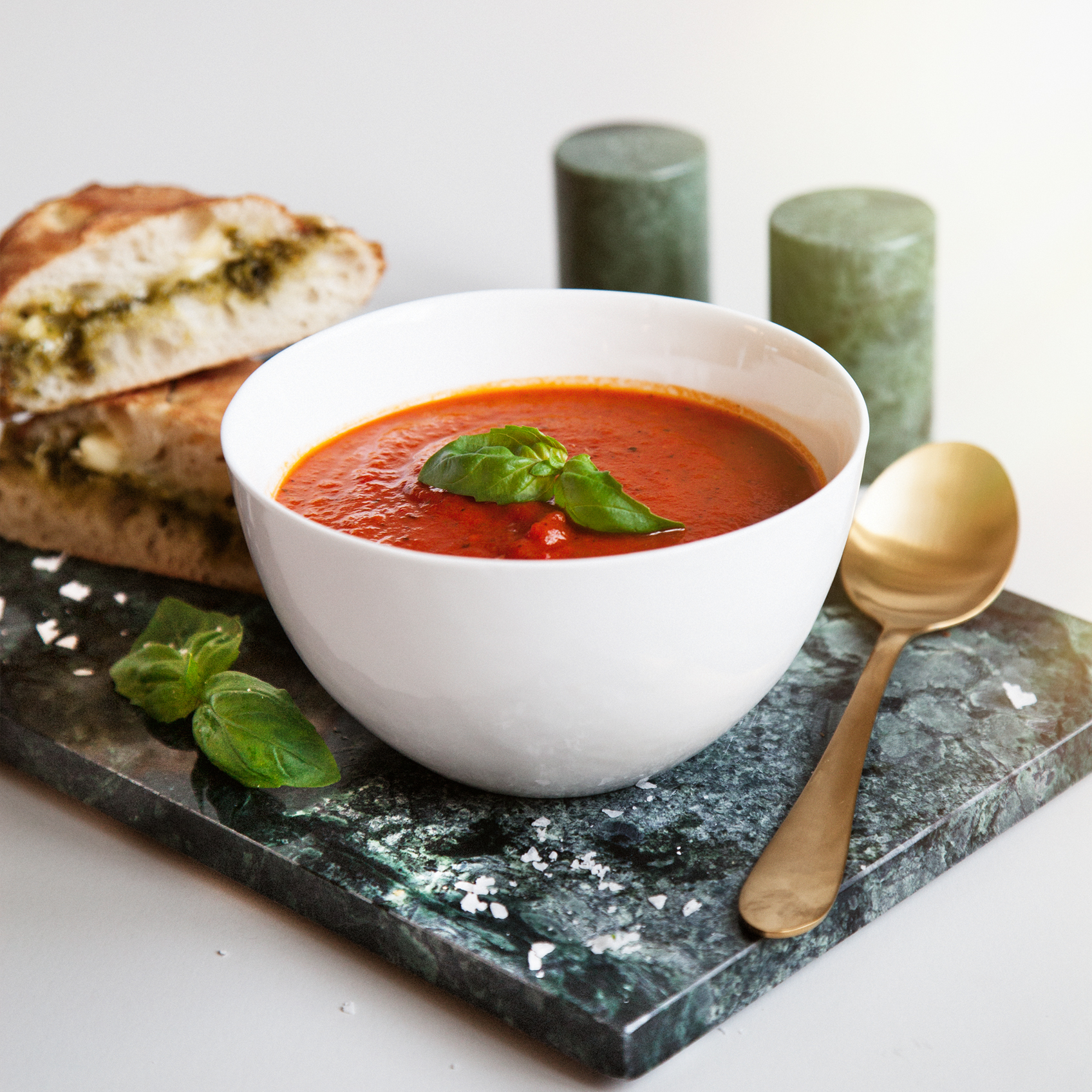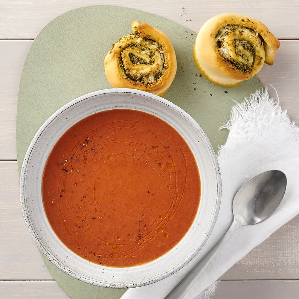 Tomatsoppa med krispig pesto- och mozzarellatoast