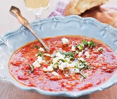 Tomatsoppa med ris, feta och basilika