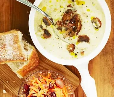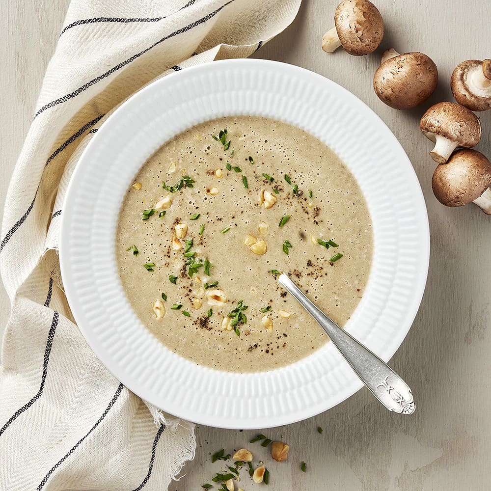 Krämig soppa med kastanjechampinjoner, mandelpotatis och rostade hasselnötter