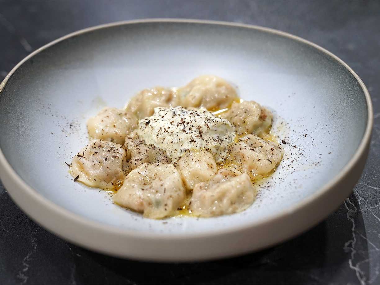 Ryska pilmeni med lamm i smörig parmesanbuljong