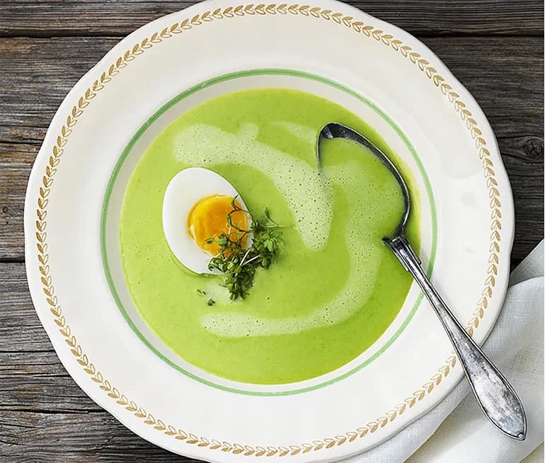 Len ärt- och potatissoppa med krasse och löskokt ägg