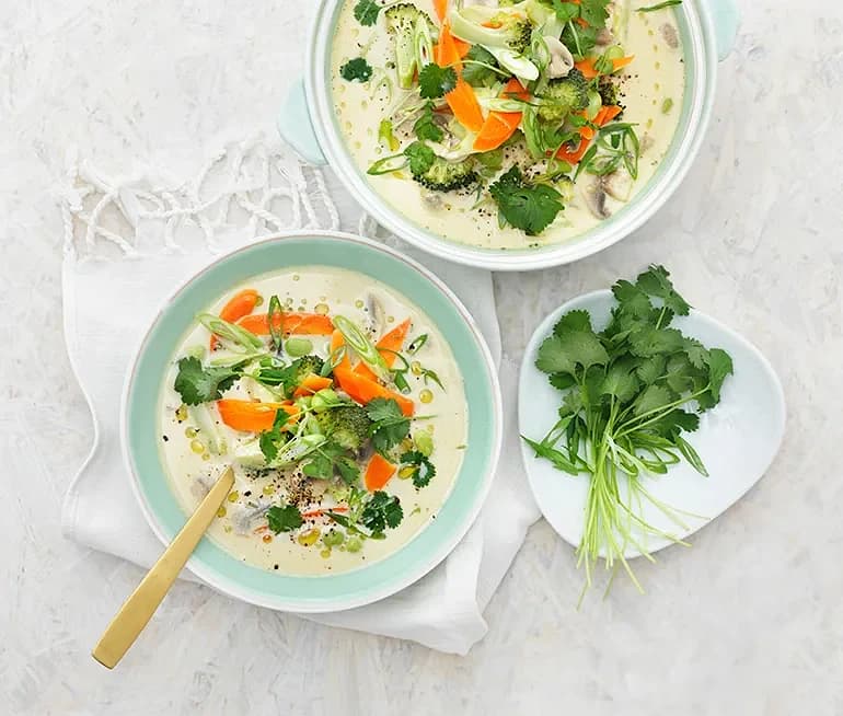 Kokos- och purjolökssoppa med bananpannkaka
