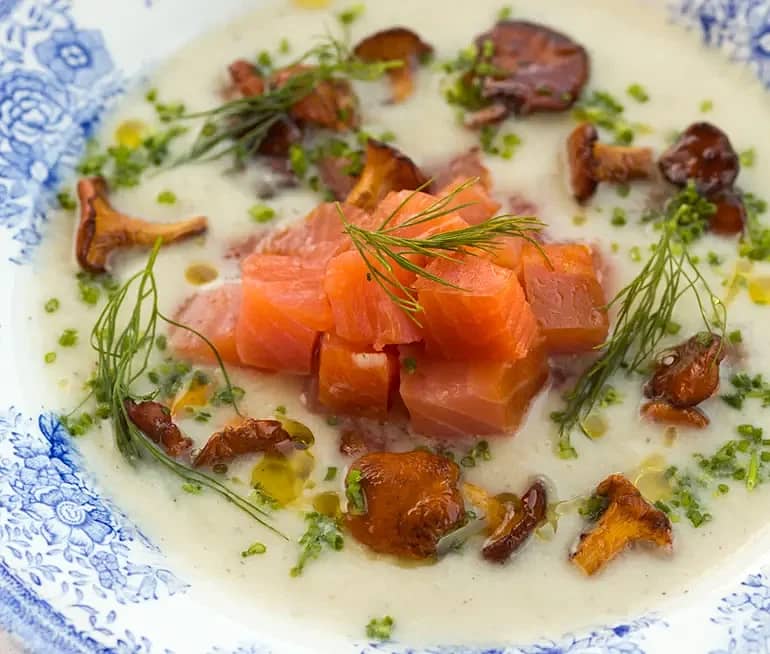 Jordärtskockssoppa med kallrökt lax