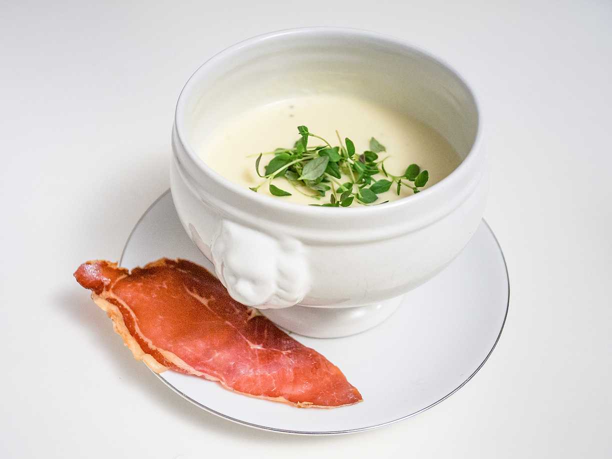 Jordärtskockssoppa med parmachips och pilgrimsmussla