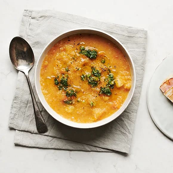 Potatis- och rotsellerisoppa med isterbandsfräs