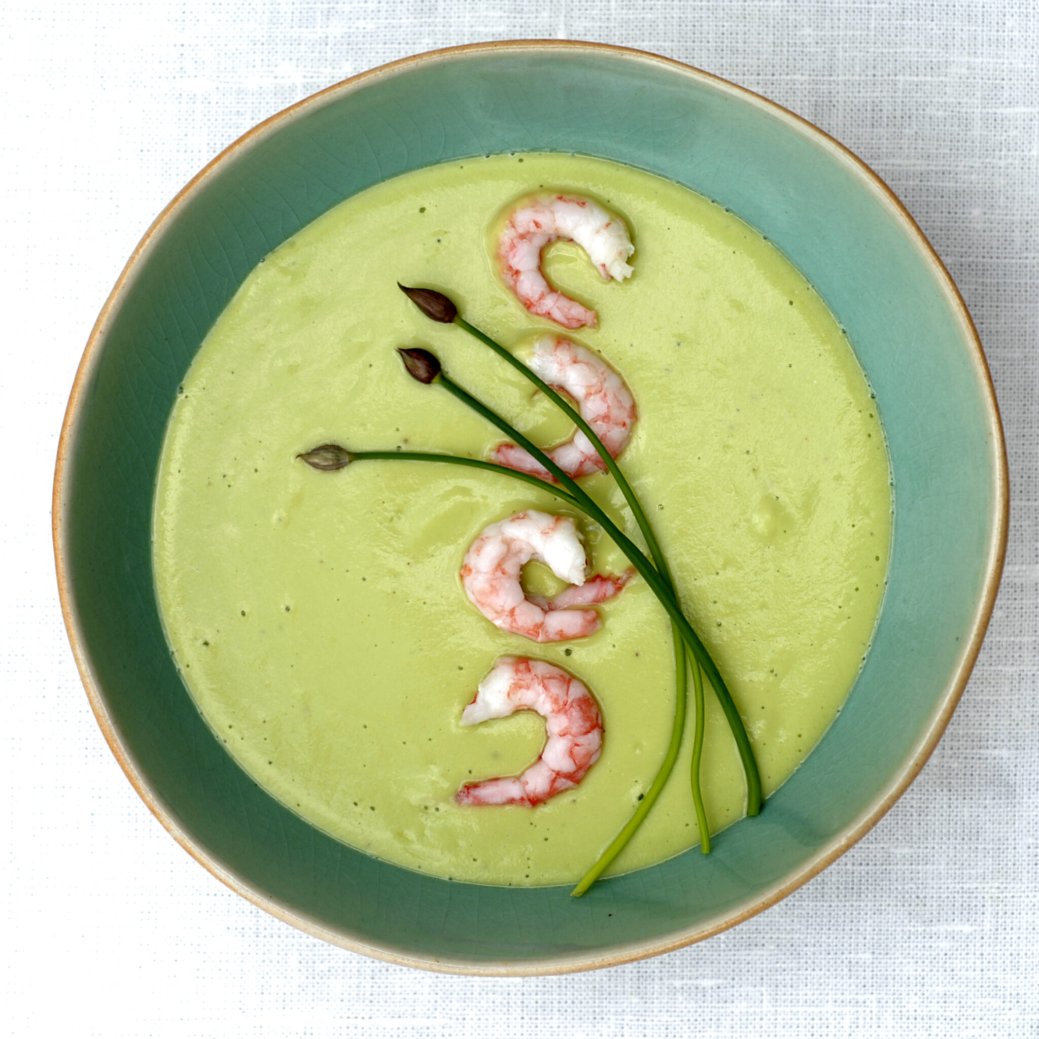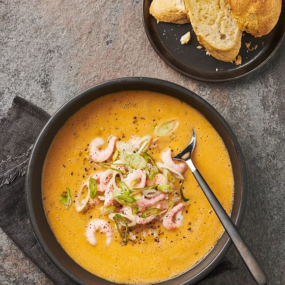 Svalkande gazpacho med kräftstjärtar och örttoast