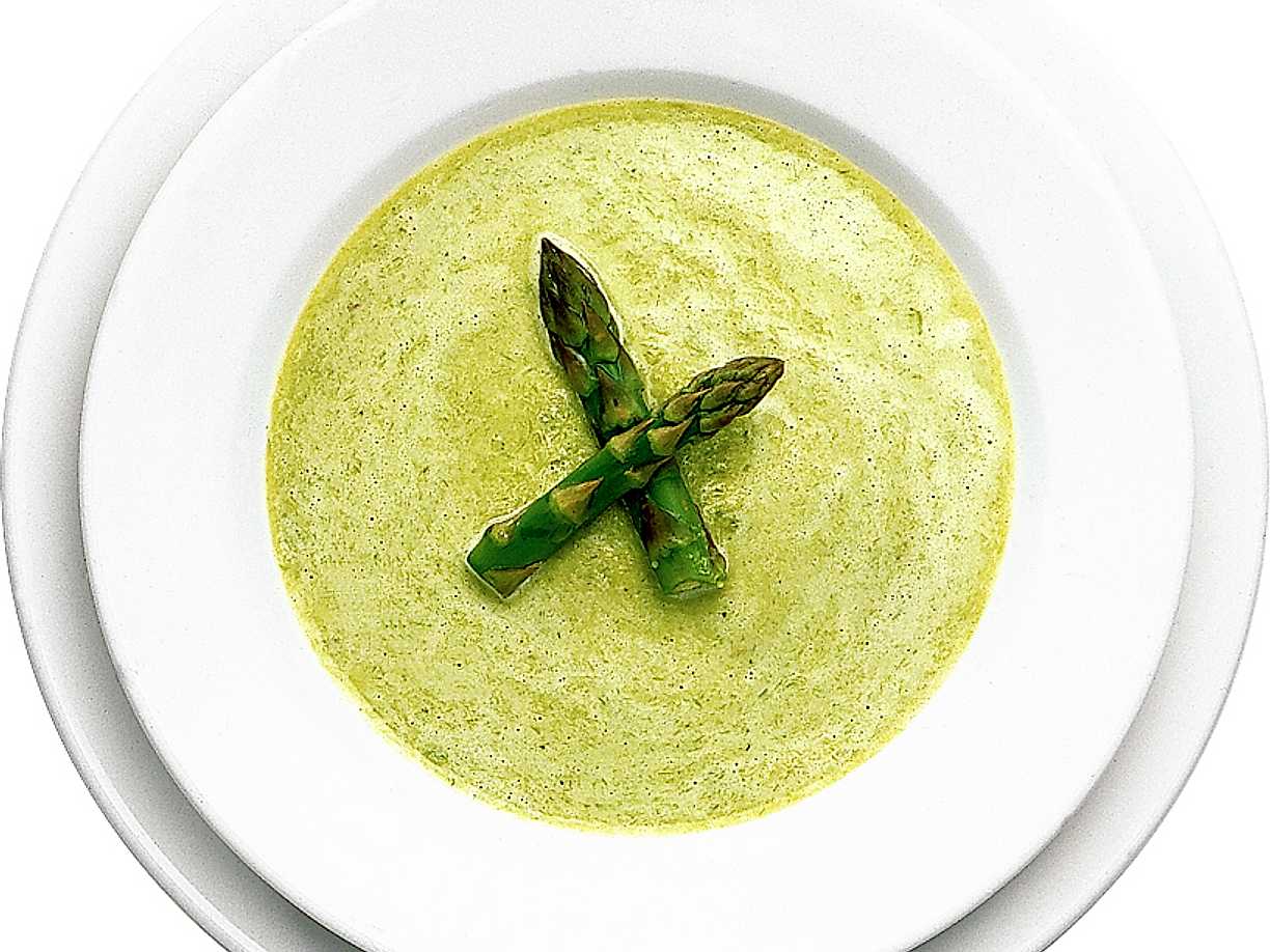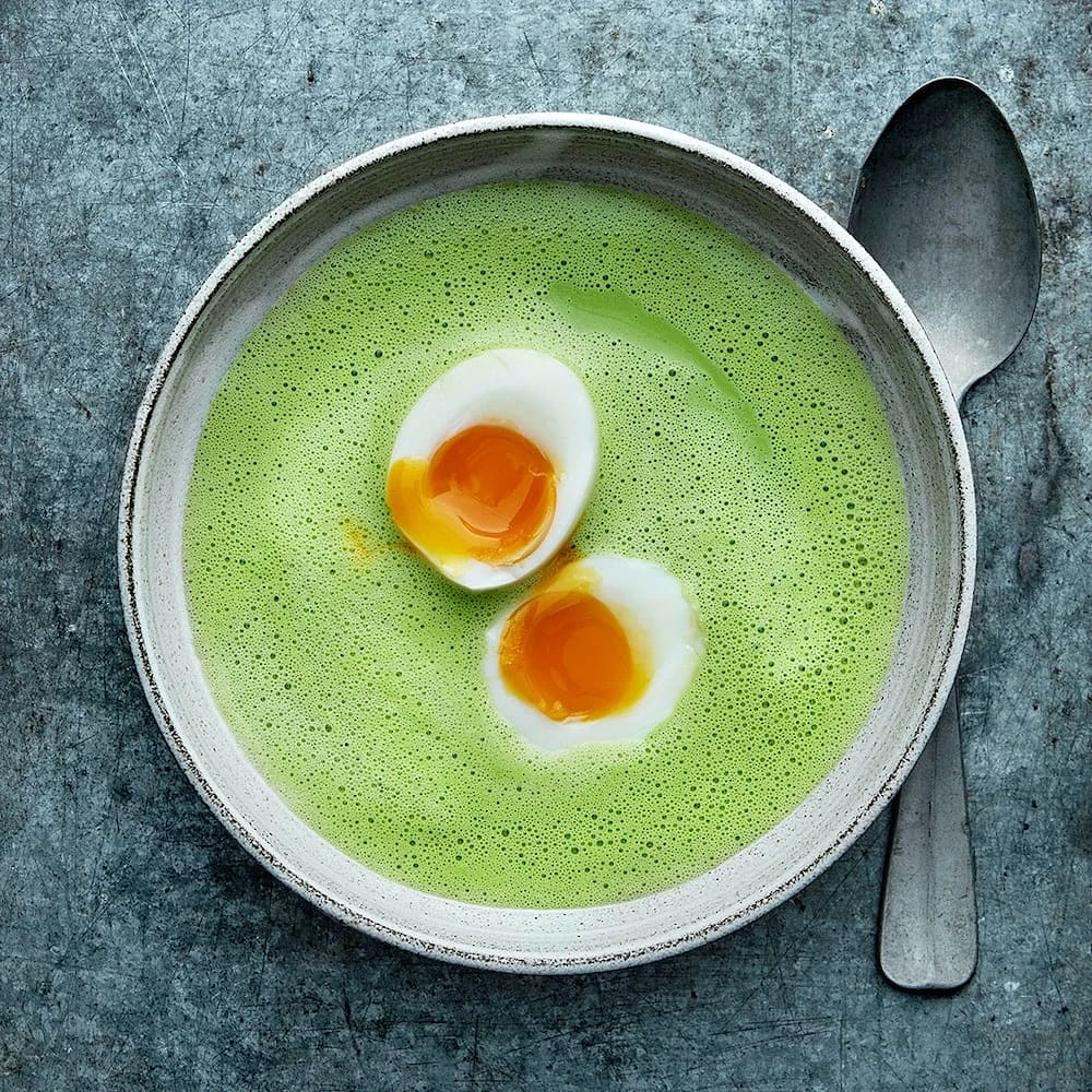Slät broccolisoppa med sting, toppad med knaperstekt bacon
