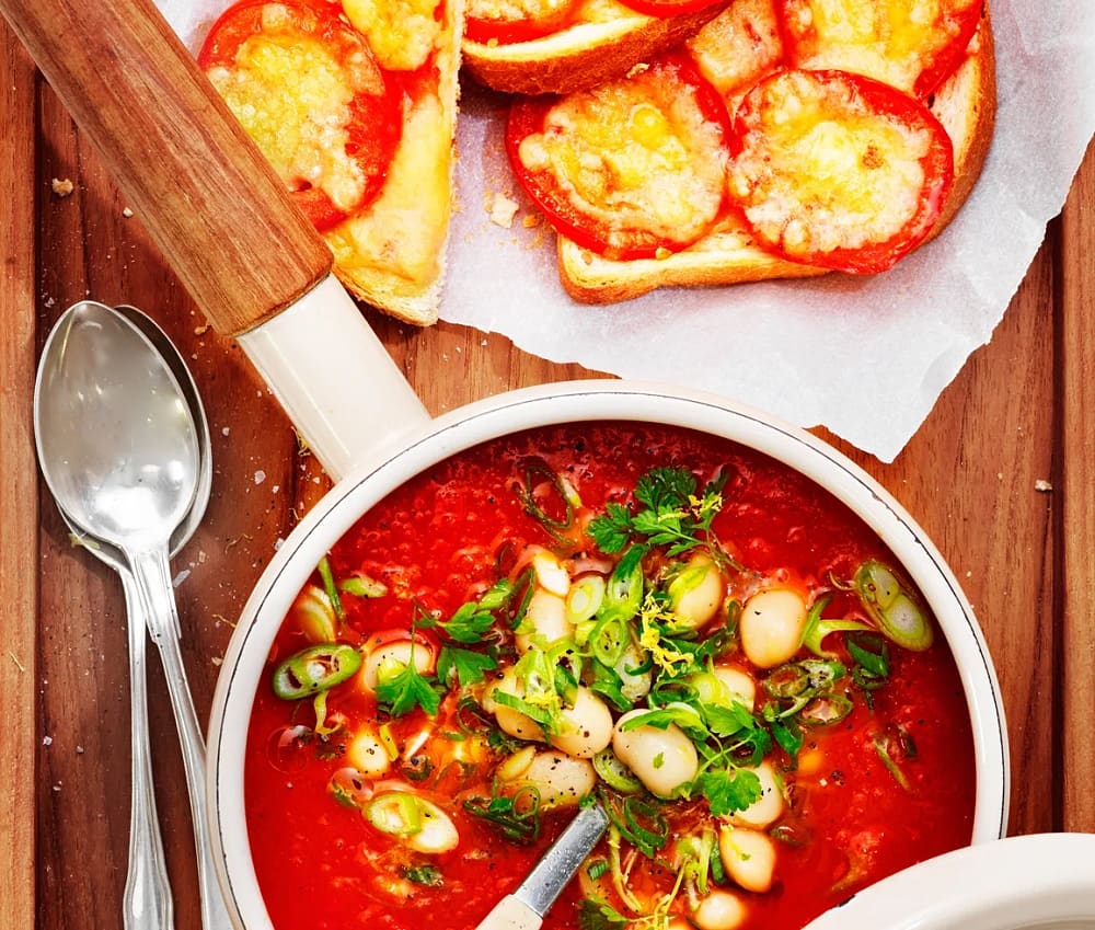 Tomatsoppa med ugnsgrillad baguette med pesto, brieost och skinka