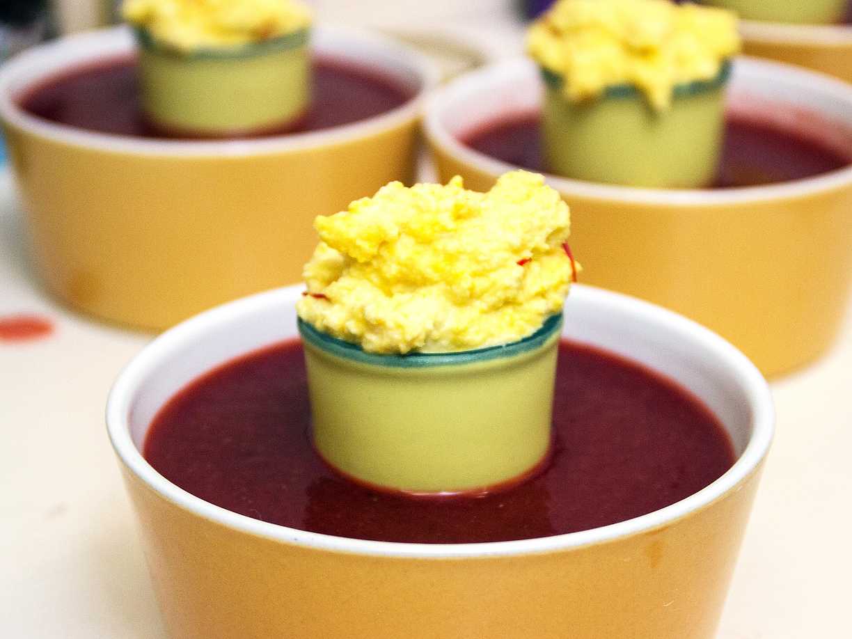Varm jordgubbssoppa, serveras med saffransmandelgrädde