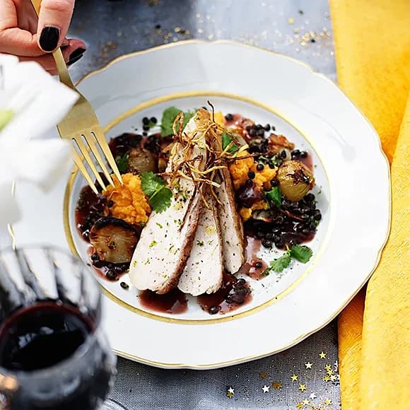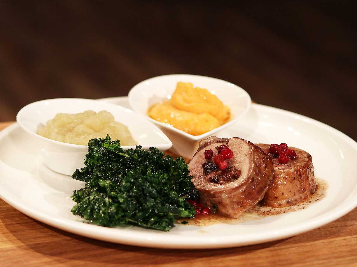 Kalkonballotine med skysås, sötpotatispuré, äppelmos och friterad grönkål