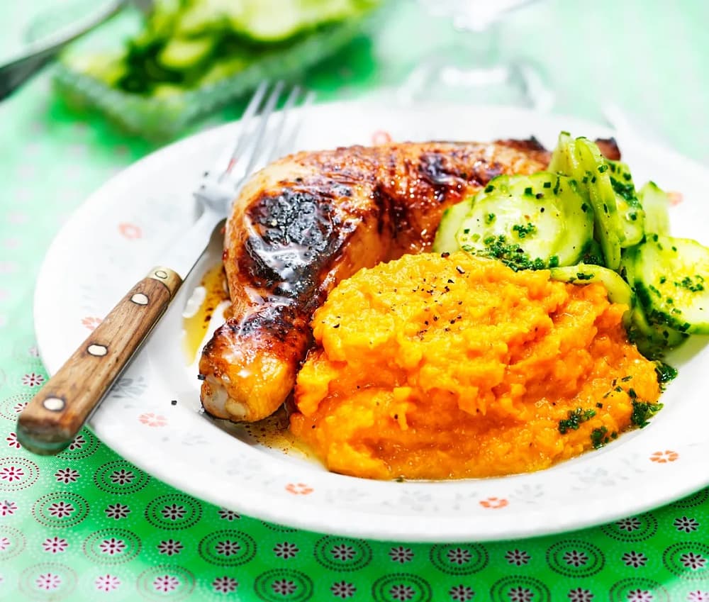 Rostad kyckling, syrlig gurka och sötpotatispuré