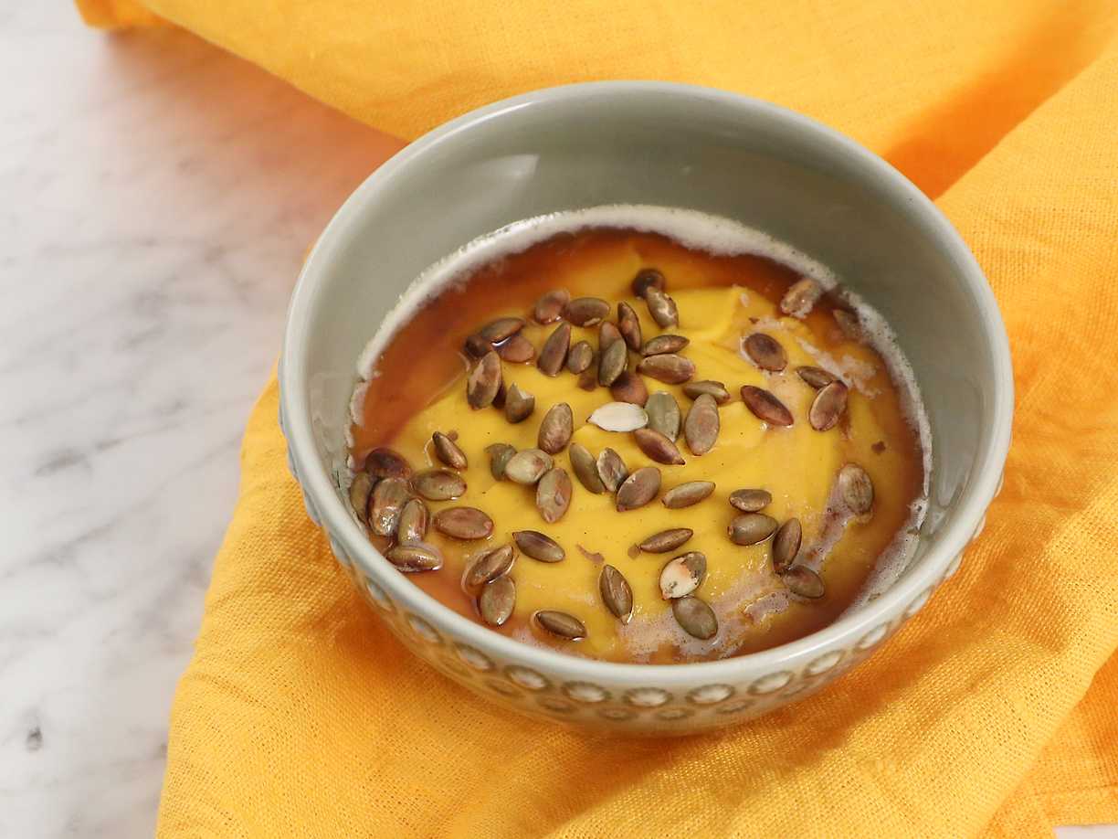Sötpotatispuré med vanilj och rostade pumpakärnor