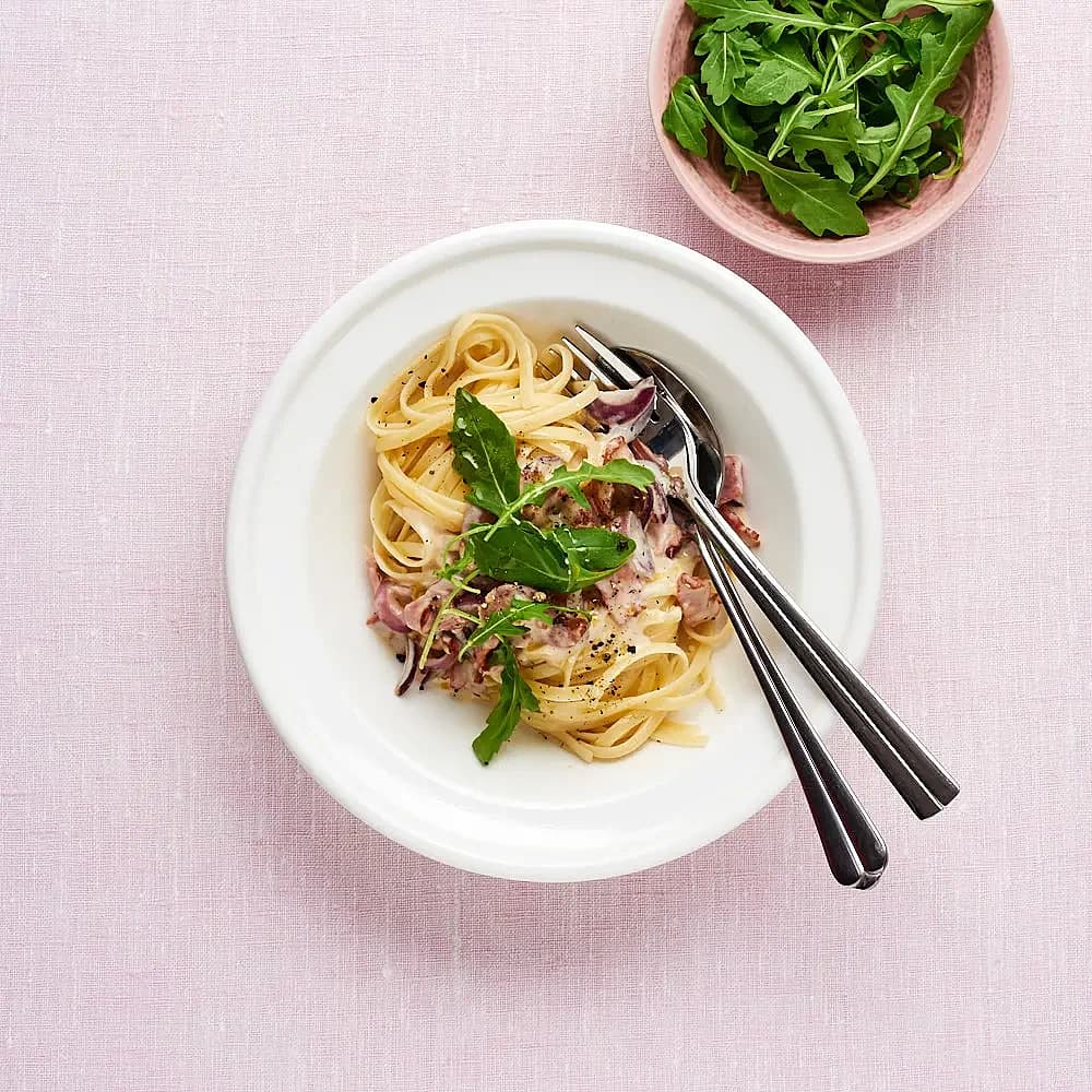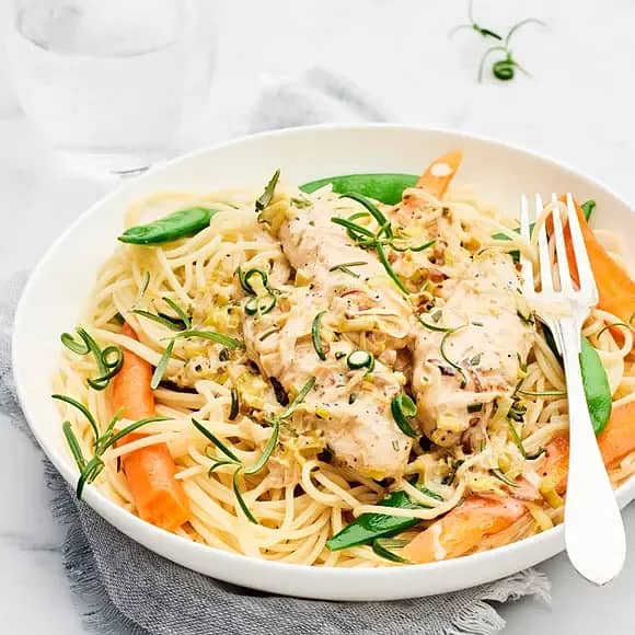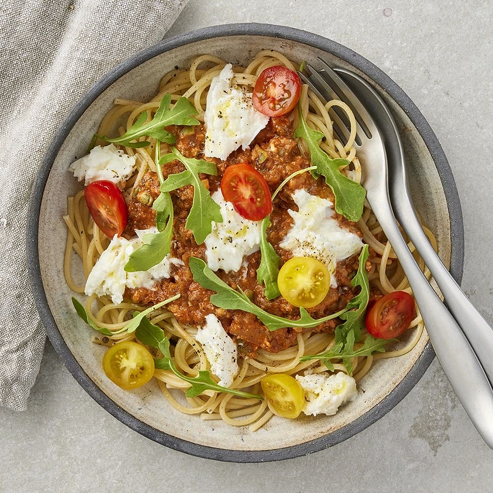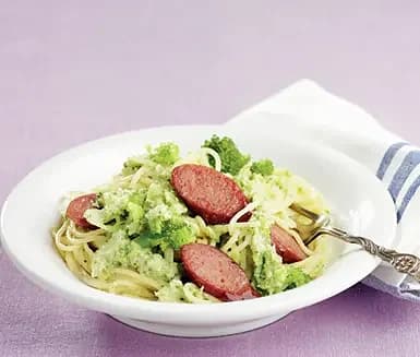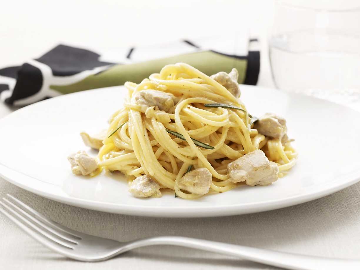 Kycklingfärssås med svampcrème fraiche och spaghetti