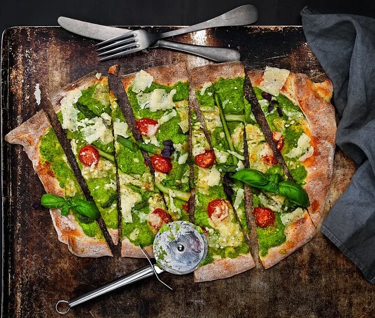 Pizza med ärtcrème, sparris och parmesan