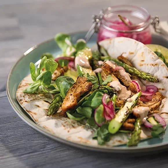 Kycklingtacos med grillad sparris & kryddig gräddfil