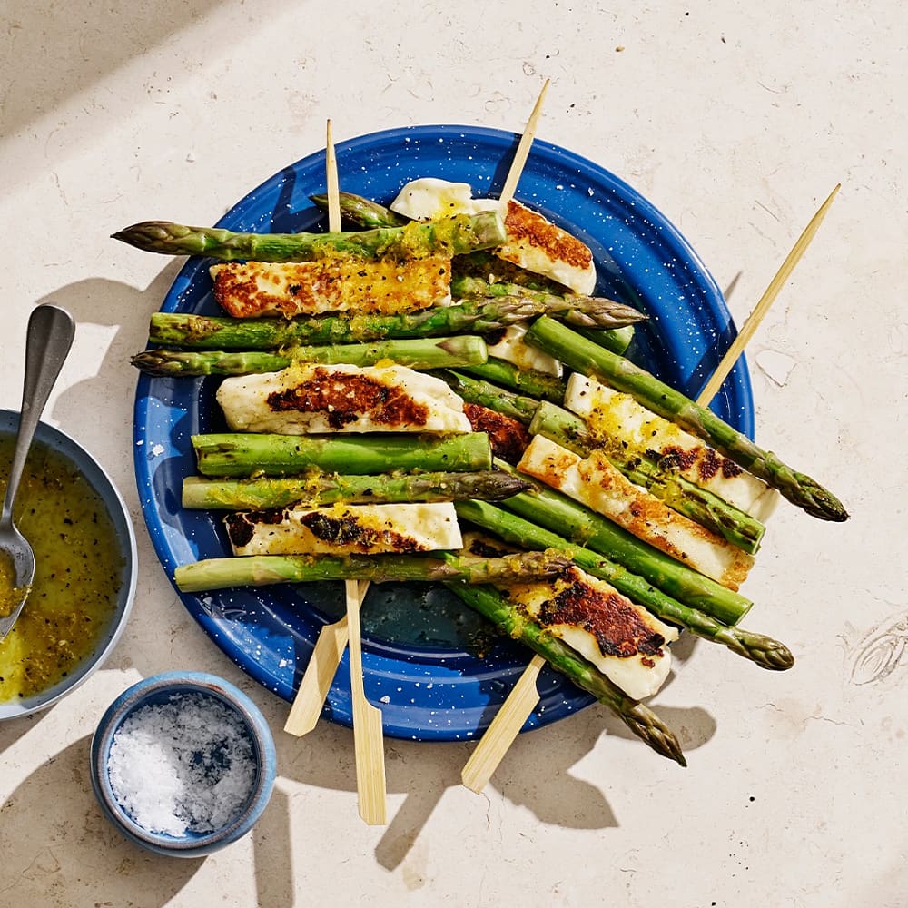 Sparris- och halloumispett med citronglaze