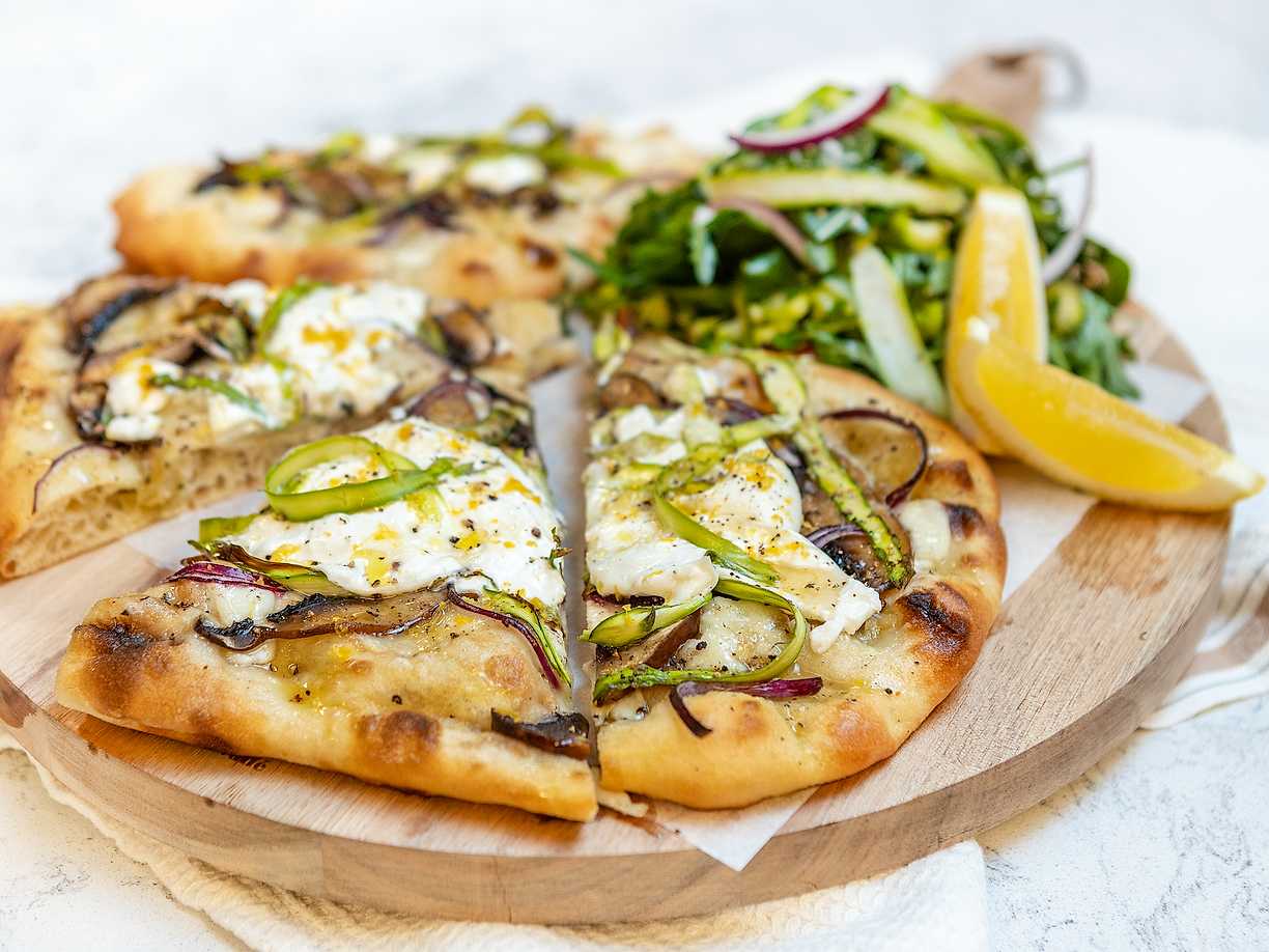 Grillad pizza med sparris, citron och burrata