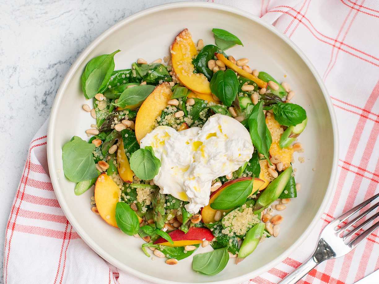 Quinoasallad med burrata, sparris och persika