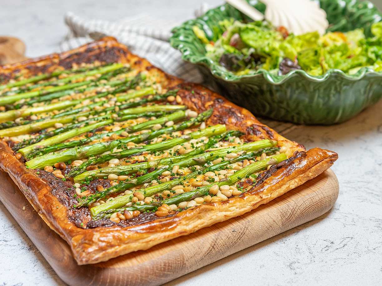 Smördegstarte med grön sparris och panzanella