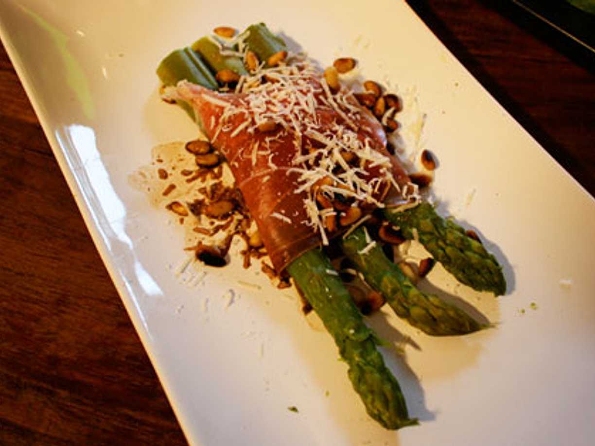 Sparris lindad i serranoskinka med ricotta och chèvrefyllning