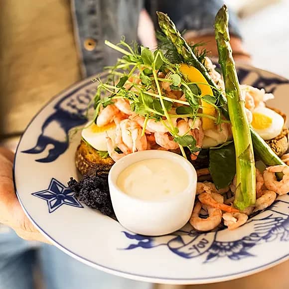 Räkmacka på grillat surdegsbröd med sparris och pepparrot