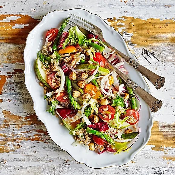 Avokadosallad med råhyvlad sparris och pinjenötter