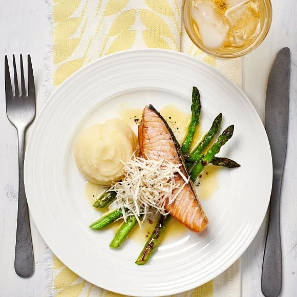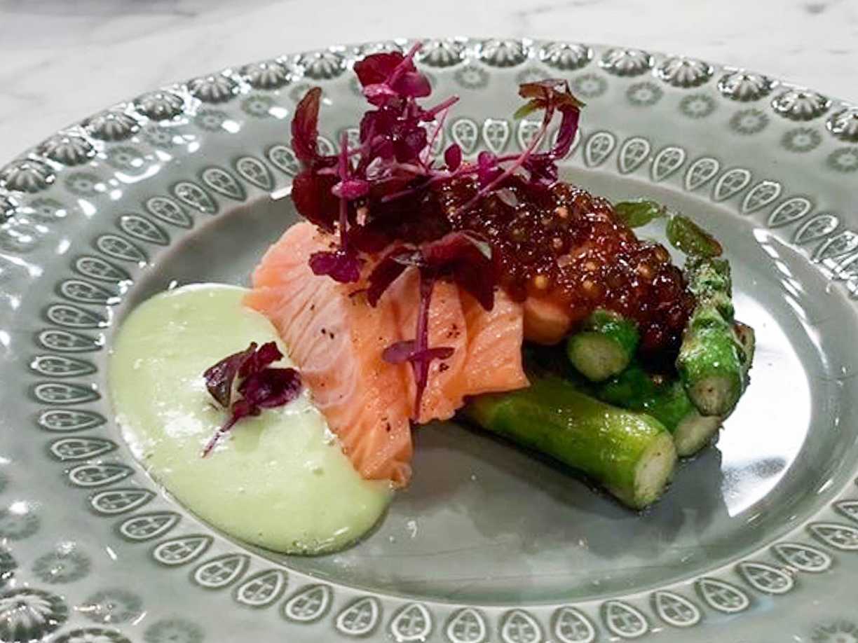 Lågtempererad lax med asiatisk glace, sparris och knipplök