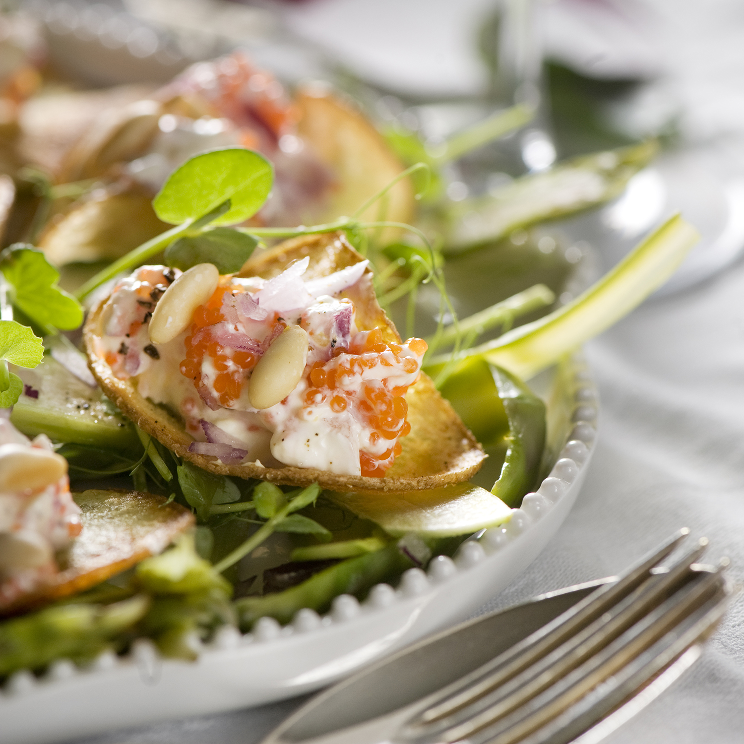 Sparris- och potatischipssallad med löjromscrème fraiche
